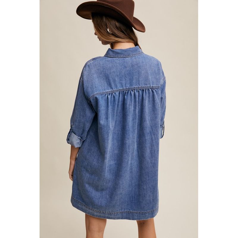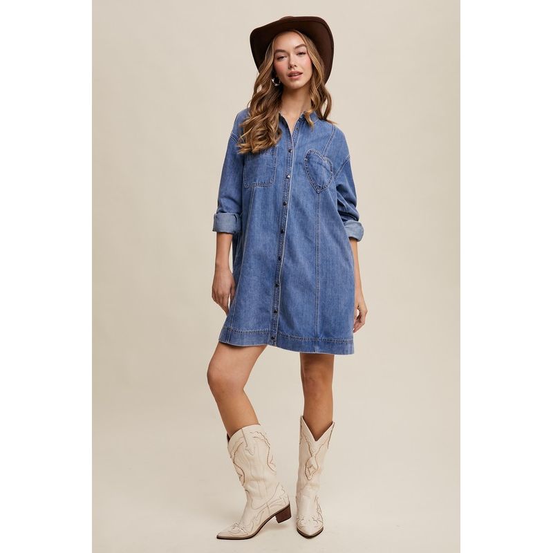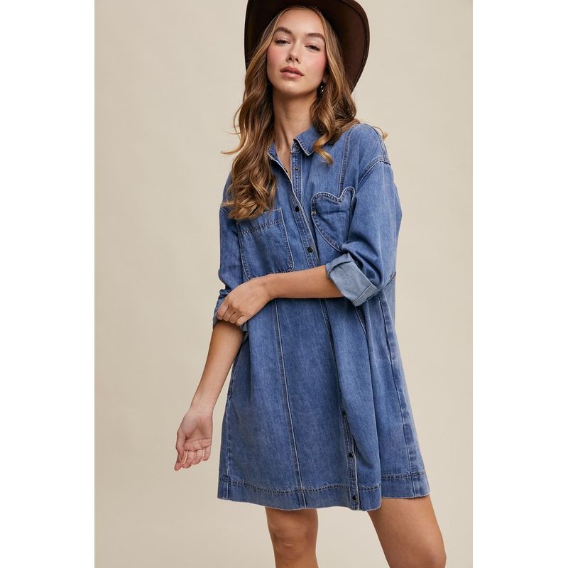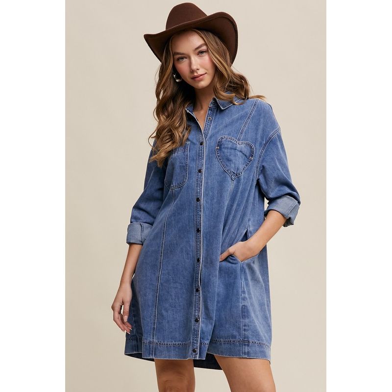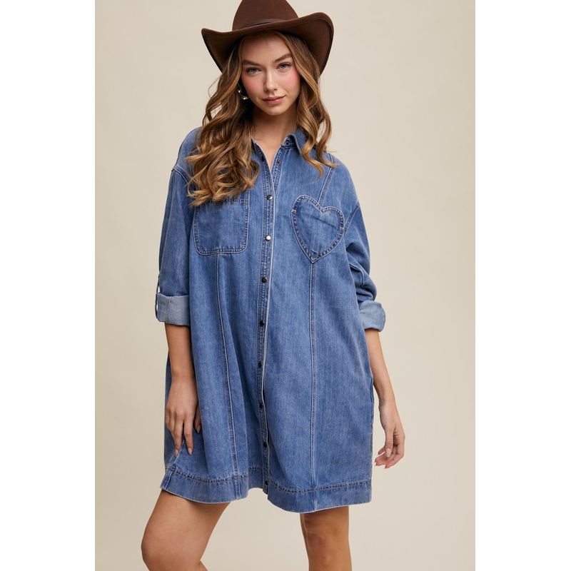 Charming Heart Pocket Detail: Features a playful heart-shaped chest pocket that adds a touch of whimsy to the classic denim design. - Relaxed Silhouette: A loose and comfortable fit that flatters a variety of body shapes. - Functional Button-Down Front: Offers easy wearability with stylish metal buttons running down the front. - Adjustable Sleeves: Long sleeves that can be rolled up and secured for versatile styling options. - Hidden Side Pockets: Practical side pockets for added convenience and functionality. - Soft Gathered Back: Subtle gathering at the yoke creates a flowing and feminine drape. - Lightweight Denim Fabric: Soft and breathable material ideal for year-round casual wear. - Model Details: The model is 5' 8" (30-24-34.5) and is wearing a size Small. Perfect for casual outings or weekend gatherings. Style with boots or sneakers for effortless charm.
