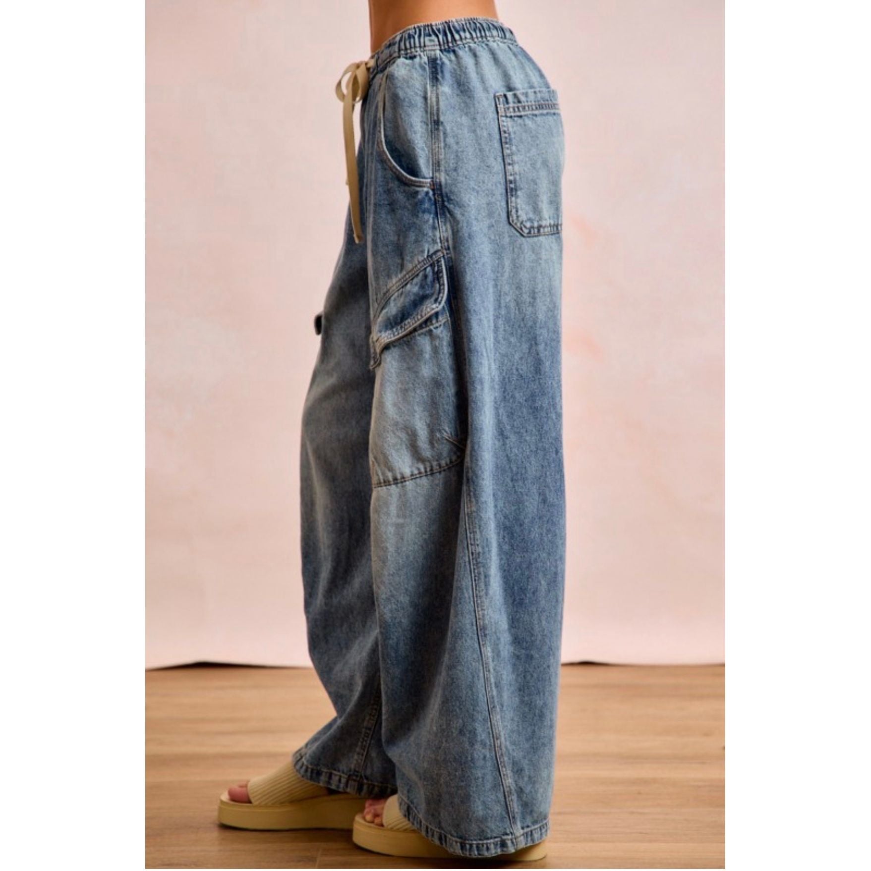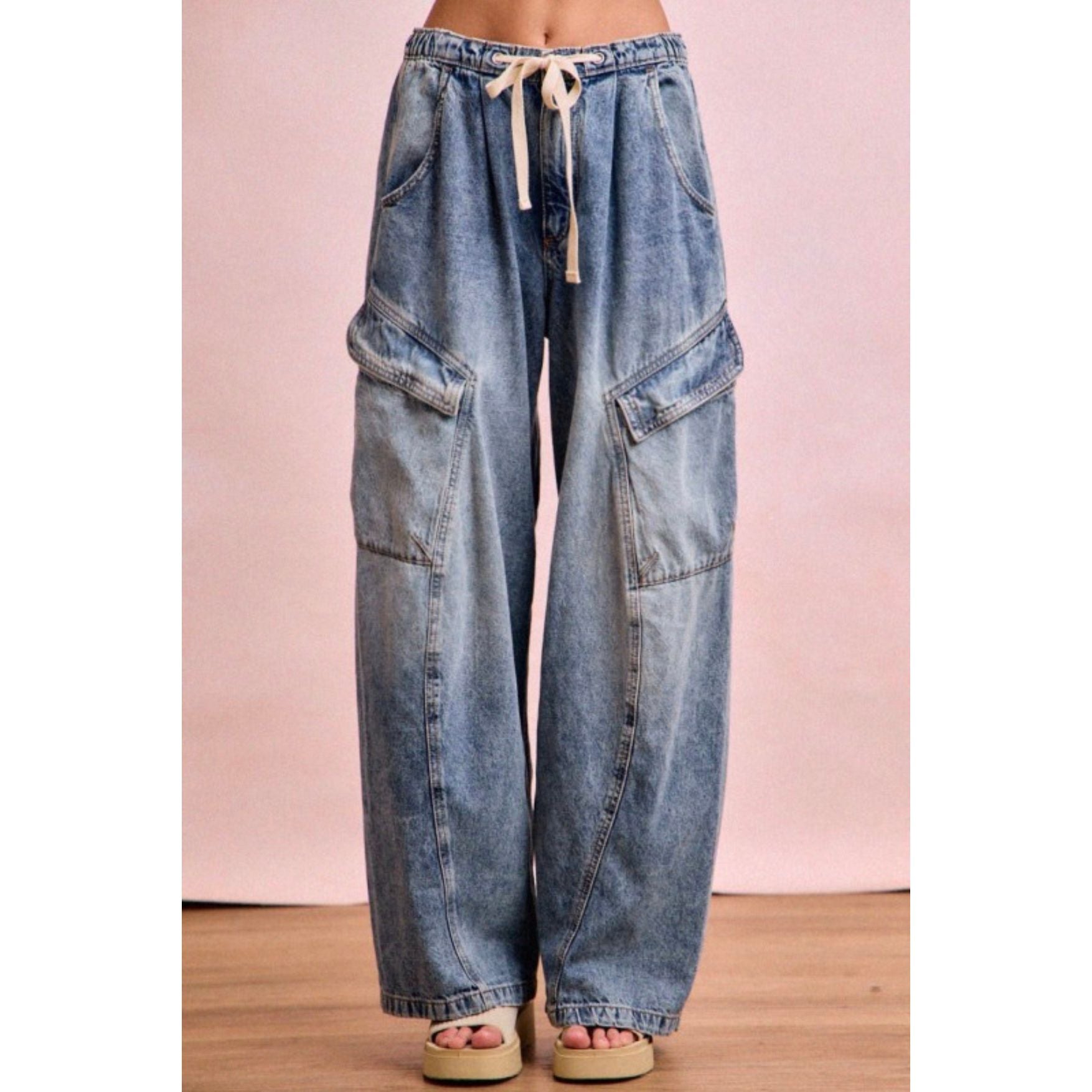 barrel cargo drawstring denim pants